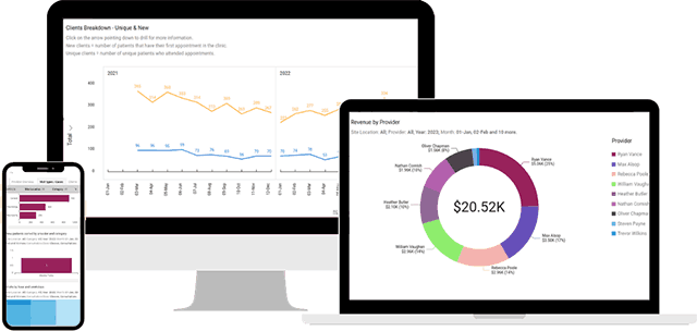 • Data from your Nookal account will be automatically gathered hourly and displayed for you in visually appealing formats like graphs or tables.